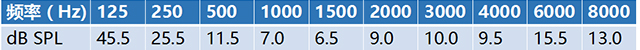 可見,兩者的單位不一致,我們在把握MPO與UCL大小時,需要了解不同頻率下的聽力零級聲壓級(如下表所示)。