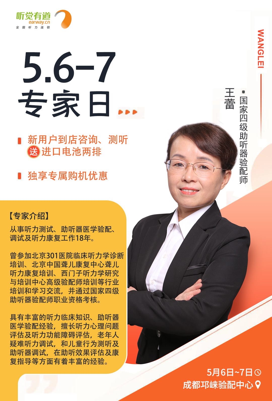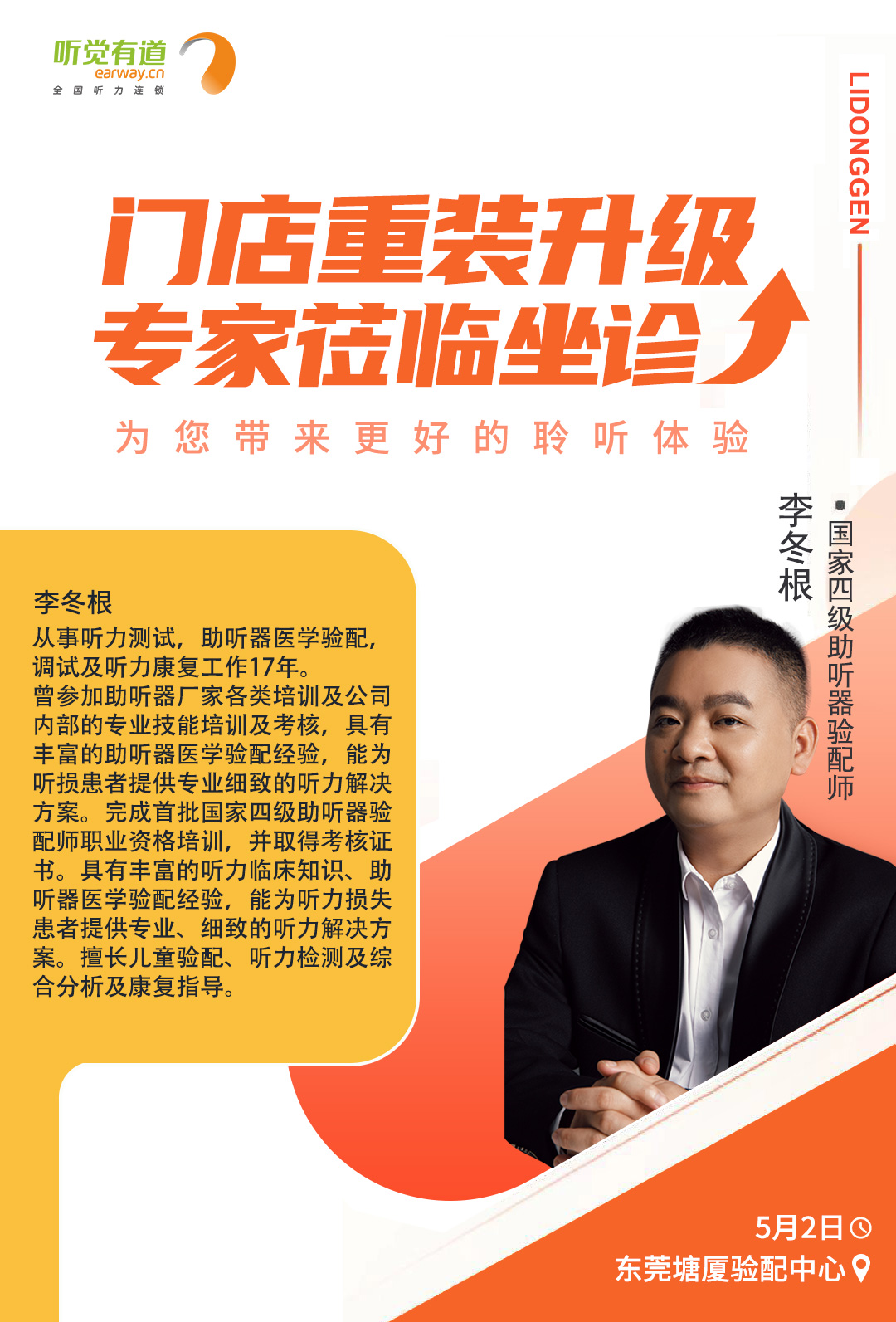<span style="white-space:pre"> </span>為了更好地服務(wù)聽損人士,帶來高質(zhì)量的聆聽感受,聽覺有道全國聽力連鎖將持續(xù)開展專家入店活動。<br /></span><p><span style="font-size:16px;"> 專家日現(xiàn)場,聽覺有道金牌聽力專家將為您解答聽力相關(guān)問題,調(diào)試和驗配助聽器,讓您能夠更好地聆聽這個世界的美好。</span></p><p style="text-align: center;"><img src="/upfiles/202104300114022603.jpg" width="640" alt="" /><br /></p><p style="text-align: center;"><br /></p><span style="font-size:16px;"> <strong>活動預(yù)告<br /><br /> 聽覺有道專家入店行程表</strong><br /><br /> 聽覺有道東莞塘廈驗配中心<br /> 時間:5月2日<br /> 專家:李冬根<br /> 電話:0769-87927386<br /> 手機(jī):18923091281<br /> 地址:廣東省東莞市塘廈鎮(zhèn)塘廈大道中70-108號(水電三局對面)<br /><br /> 聽覺有道達(dá)州開江驗配中心<br /> 時間:5月6日~7日<br /> 專家:羅夢薇<br /> 電話:0818-8222079<br /> 手機(jī):19182813889<br /> 地址:四川省達(dá)州市開江縣新寧鎮(zhèn)龍池街77號(開江縣人民醫(yī)院正門對面)<br /><br /> 聽覺有道成都邛崍驗配中心<br /> 時間:5月6日~7日<br /> 專家:王蕾<br /> 電話:028-88734181<br /> 手機(jī):18908177682<br /> 地址:四川省邛崍市鳳凰大道484號高宇南庭(醫(yī)療中心醫(yī)院對面)<br /><br /></span><span style="white-space:pre"><span style="font-size:16px;"> 聽覺有道閬中張飛南路旗艦中心<br /> 時間:5月18日~19日<br /> 專家:王杰<br /> 電話:0817-6250177<br /> 手機(jī):17398130629<br /></span></span><p><span style="white-space:pre"><span style="font-size:16px;"> 地址:四川省閬中市張飛南路126號(人民醫(yī)院正對面)</span></span></p><p style="text-align: center;"><img src="/upfiles/202104300134599048.jpg" width="640" alt="" /> <img src="/upfiles/202104300134592952.jpg" width="640" alt="" /> <img src="/upfiles/202104300134592080.jpg" width="640" alt="" /><br /></p><p style="text-align: center;"><img src="/upfiles/202104300135382254.jpg" width="640" alt="" /><br /></p><p style="text-align: center;"><br /></p>" />
